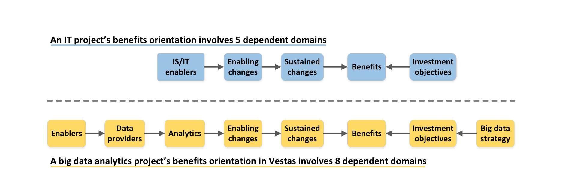 Et Big Data Analytics-projekt gennemgår otte forskellige domæner, hvor der skabes sammenhæng imellem BDA-værdier, den organisatoriske forandring og den teknologi, der udvikles. Der arbejdes fra højre mod venstre for at fokusere på værdiskabelse og ikke udelukkende den data eller analyse, man ønsker at implementere.